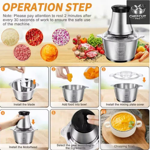 ChefCut Pro es una picadora eléctrica diseñada para simplificar tu cocina. Con su motor de 200W y sus cuatro cuchillas de acero inoxidable, puede picar carnes, verduras, frutos secos y condimentos de forma rápida y uniforme.
